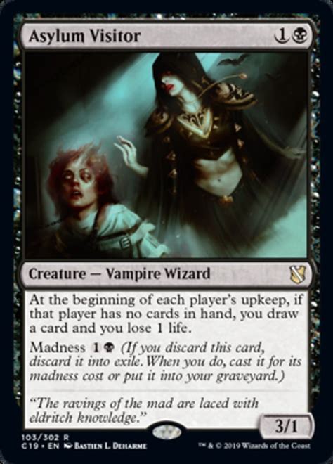 First things first, let’s get acquainted with the star of the show: Asylum Visitor . This card, hailing from the Shadows over Innistrad set, is a 2 2 Human Wizard creature for one black mana and one colorless mana. Its abilities are what truly make it stand out. Whenever you draw a card, and if you have no cards in hand, Asylum Visitor gets +1/+1 until end of turn. Additionally, it has madness {B} which allows you to cast it for {B} when discarded. Pretty neat, right?