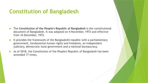 Think of the Constitution of the People’s Republic of Bangladesh as the ultimate rulebook. Adopted in 1972, it’s been amended a few times, but its core principles remain. This document lays down the foundation for the country’s governance, ensuring a balance of power and protecting the fundamental rights of its citizens. It’s pretty complex, but let’s break down the key components that make up Bangladesh’s constitutional setup.