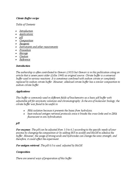 Okay, so before we get our hands dirty, let’s quickly chat about what citrate buffer actually is . In the simplest terms, it’s a solution that resists changes in pH. Think of it as a pH bodyguard! It’s made by mixing citric acid and its salt (like sodium citrate) in specific ratios. This dynamic duo works together to keep the pH stable, which is crucial in many experiments. Why? Because enzymes and other biological molecules are super sensitive to pH changes; even a slight shift can throw everything off. Citrate buffers are especially great in the slightly acidic range, typically between pH 3.0 and 6.2. They are commonly used in food science, biochemistry, and pharmaceuticals because they are effective at these lower pH levels. The buffer’s ability to maintain a stable pH is critical for enzymatic reactions, where pH can significantly influence enzyme activity and substrate binding. In food science, citrate buffers help control acidity, affecting taste and preservation. Moreover, in pharmaceutical formulations, these buffers ensure drug stability and efficacy by preventing degradation due to pH fluctuations.