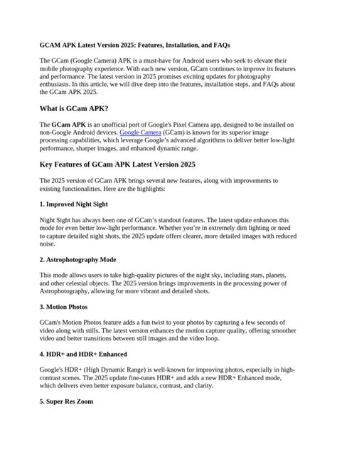 When you get your hands on the GCam latest version , you’re not just getting a camera app; you’re unlocking a suite of powerful features that can make your photos pop. HDR+ Enhanced is a cornerstone. It intelligently captures multiple frames with varying exposures and then merges them to create images with incredible detail in both the bright highlights and dark shadows. This means no more blown-out skies or muddy-looking dark areas. For low-light photography, Night Sight is an absolute game-changer. It can turn near-darkness into surprisingly well-lit and detailed shots, often without needing a flash. It’s like having night vision for your phone! Portrait Mode uses software to simulate the shallow depth-of-field effect you get from dedicated cameras with large sensors and lenses. It intelligently identifies the subject and blurs the background (bokeh), making your portraits look professional and drawing attention to your subject. The latest versions often bring improvements to this, making edge detection more accurate and the blur more natural-looking. Astrophotography Mode is another jaw-dropper, available in some ports and later GCam versions. If you can get your phone steady (using a tripod is highly recommended), this mode can capture stunning images of the night sky, revealing stars and even nebulae that are invisible to the naked eye. Other features you might find include improved Super Res Zoom , which uses software tricks to enhance detail when digitally zooming, and enhanced video recording capabilities. Many ports also offer ** सans-engine settings** that allow you to fine-tune parameters like saturation, contrast, and sharpness, or load XML configuration files specific to your device and sensor to optimize performance. The beauty of GCam lies in its computational power; it’s constantly working behind the scenes to make every shot better. Whether it’s improving skin tones in portraits, reducing noise in low light, or ensuring vibrant, true-to-life colors, the GCam latest version aims to deliver consistently excellent results that often surpass what native camera apps can achieve. It’s the software wizardry that truly sets it apart, guys.