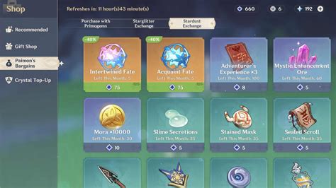 Next up on our Genshin Impact shop UI tour is the Stardust Exchange . This section is super cool because it refreshes monthly, offering a rotating stock of valuable items. The primary draws here are the Intertwined Fates and Acquaint Fates . Intertwined Fates are used for wishing on event banners (where the featured 5-star characters and weapons usually are), and Acquaint Fates are for the standard banner. You get a limited number of each per month, so it’s essential to prioritize grabbing these if you’re actively wishing. Besides Fates, you’ll often find essential EXP materials (like Adventurer’s Experience and Hero’s Wit) and Mora . These are always in demand, especially as you start leveling up new characters or weapons. Sometimes, you might even see rare items like Talent Books or Artifact Enhancement Ores . The key takeaway here is that the Stardust Exchange is a fantastic way to supplement your Fates and materials using Masterless Stardust , a currency you get from receiving duplicate 3-star and 4-star weapons and characters when you wish. It might seem small at first, but hoarding that Stardust and using it here monthly can significantly boost your wishing power and progression. Don’t underestimate the value of these monthly refreshes, guys; they are a lifeline for F2P (free-to-play) players and a helpful boost for spenders alike. Make it a habit to check this section every month and snag those Fates first. The other items are great too, but the Fates are usually the most sought-after commodity here. Think of it as your monthly ‘must-buy’ list from the shop!