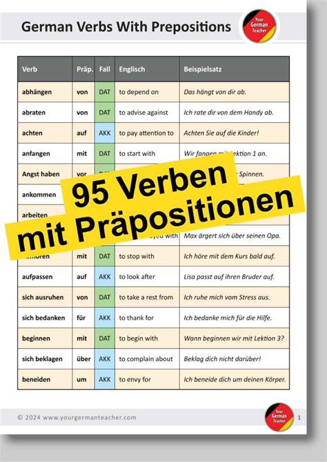 Hey everyone! Let’s dive deep into something super important for nailing your German game: verbs with prepositions . You know, those tricky combinations that can totally change the meaning of a sentence? It’s like learning a secret code, and once you crack it, your German fluency skyrockets. We’re going to break down why these are so crucial, explore some common examples, and give you the lowdown on how to actually learn and remember them without losing your mind. So, grab a coffee, get comfy, and let’s get this German grammar party started! Understanding verbs with prepositions in German is not just about memorizing lists; it’s about grasping the nuances that make the language so rich and expressive. Think of it as adding color to a black and white drawing. Without the right prepositions, your sentences might be grammatically correct, but they’ll likely sound a bit off, or worse, convey a completely unintended meaning. This is where many learners stumble, myself included when I first started out. The sheer volume of verbs and their associated prepositions can seem overwhelming, but trust me, with a structured approach and consistent practice, you’ll be using them like a native in no time. We’ll explore how these verbs often have idiomatic uses, meaning their meaning isn’t always a direct translation from English or any other language. This is a key aspect of mastering German, and by focusing on these specific verb-preposition pairings, you’re building a strong foundation for more complex sentence structures and idiomatic expressions. Get ready to boost your confidence and impress your German-speaking friends!