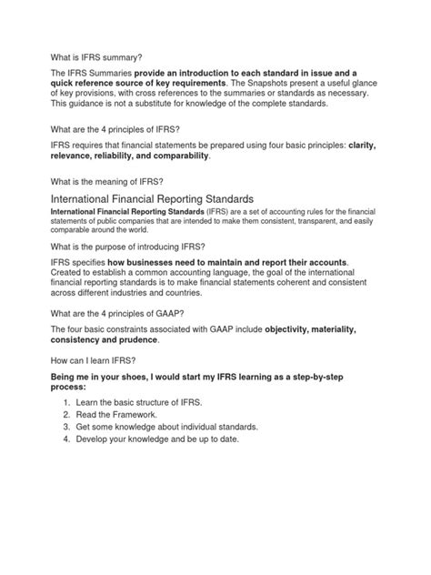 Hey guys! So, you’re probably here because you need a solid grasp of what IFRS (International Financial Reporting Standards) are all about, and you’re looking for a handy IFRS summary list , right? Well, you’ve come to the right place! Understanding IFRS can feel like navigating a maze sometimes, but it’s super important for anyone involved in global finance. Think of IFRS as the universal language for financial reporting. It’s designed to make financial statements comparable and understandable across different countries and industries. Without it, comparing a company in Germany to one in Japan would be a nightmare, with different rules and formats making it impossible to get a clear picture. The goal here is to break down the essentials of IFRS for you, giving you a clear and concise overview. We’ll be diving into some of the most crucial standards, explaining what they mean and why they matter. So, grab a coffee, get comfy, and let’s demystify IFRS together! We’ll make sure you walk away with a much better understanding of these vital accounting principles. This summary is tailored to be easily digestible, even if you’re new to the world of international accounting. We want to give you the core knowledge without overwhelming you with jargon. Remember, a good understanding of IFRS can open up a world of opportunities, whether you’re a student, an accountant, an investor, or just someone curious about how businesses report their financial health globally.