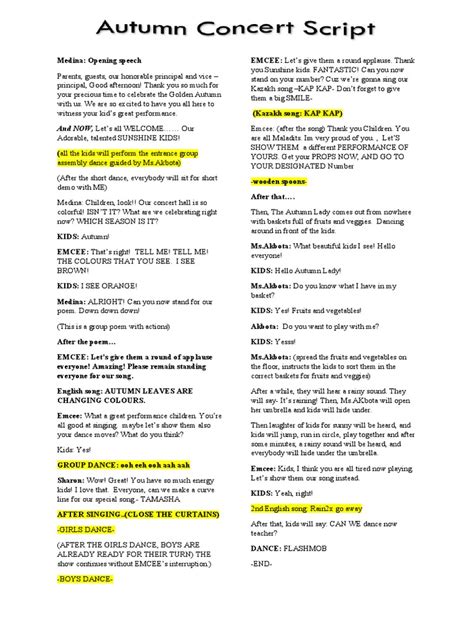 Alright, let’s dissect what goes into creating these detailed scripts. The core of any concert script involves a few critical components. First off, you’ll find the Running Order . This is basically the timeline of the show, which includes the order of the songs, the time allocated for each song, and the breaks or transitions between performances. It helps everyone involved to know what’s coming up next, so the concert keeps the flow and avoids delays. Another element to be found in the script is a stage plot . This is a visual representation of the stage setup, which is used by the artists and the crew. The stage plot explains the position of the instruments, microphones, speakers, and any props that the artists will use. For example, if there is a fireworks show planned, the stage plot will explain the placement of the fireworks launchers. This allows the crew to prepare the stage and ensure that everything is in its place. The script also contains lighting cues . Lighting plays a crucial role in creating the atmosphere for a concert. These cues indicate how the lighting should change during the show. The cues are usually coordinated with the music or the mood that the artist wants to deliver. For example, the lighting engineer might be instructed to use a spotlight during a guitar solo or use a dim light to build the tension before the chorus. The script will provide all the cues about the lights, so the lighting engineer can coordinate the lighting system.