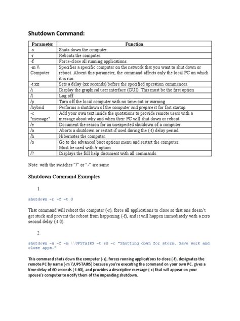 Alright guys, let’s kick things off with Windows. The star of the show here is the shutdown command. It’s incredibly versatile, and once you get the hang of it, you’ll wonder how you ever lived without it. The basic syntax is shutdown [options] . Let’s break down some of the most useful options. To simply shut down your computer, you’d type shutdown /s . Easy peasy, right? But what if you want to restart it instead? Just use shutdown /r . Need to log off the current user? That’s shutdown /l . Now, here’s where it gets really cool: scheduling shutdowns . You can use the /t switch followed by the number of seconds until the shutdown occurs. So, to shut down in 60 seconds, you’d type shutdown /s /t 60 . This is fantastic if you need a little time to save your work or let others know you’re logging off. Worried about programs preventing the shutdown? Add the /f flag (force) to close all running applications without warning. So, shutdown /s /f /t 60 will force a shutdown in one minute. Remember, forcing a shutdown can lead to data loss if applications haven’t saved, so use it judiciously! For system administrators, the /m \computername option is a game-changer, allowing you to initiate shutdowns or restarts on remote machines. You can combine this with other flags, like shutdown /r /m \RemotePC /t 120 , to restart a remote computer in two minutes. Always ensure you have the necessary permissions before attempting remote actions, though! Finally, you can add a message to the shutdown prompt using the /c "Your message here" option, which is super helpful for informing users why a shutdown is happening. It’s all about giving you that granular control, and the shutdown command in Windows definitely delivers.