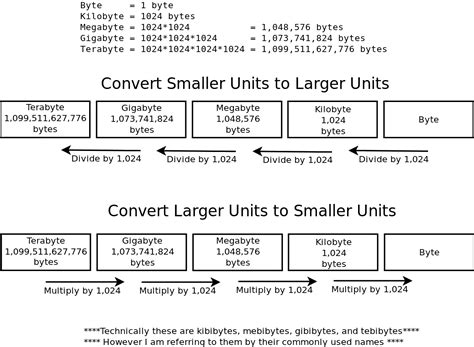 So, you see, each unit is 1024 times larger than the previous one. This is because computers use a binary system (base-2), where data is represented in powers of 2. Thus, 2^10 (which is 1024) becomes a standard conversion factor.