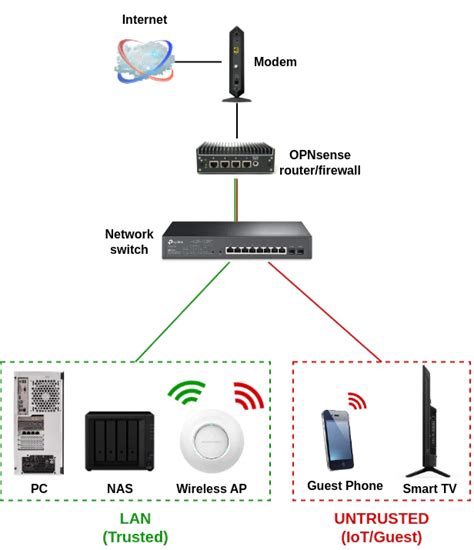 Step 4: Map Out Your Network Segments and Zones . Now, connect your network segments to the appropriate OPNsense interfaces. Draw boxes or distinct areas for your LAN, DMZ, IoT VLAN, Guest VLAN, etc. Label each zone clearly. Use different colors for different zones to enhance readability. This step visually separates your trusted internal network from less trusted zones and the internet.