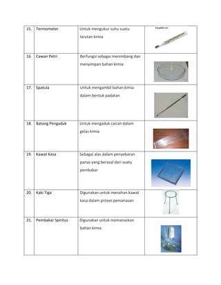• Spatula: Buat mengambil atau memindahkan bahan kimia padat.