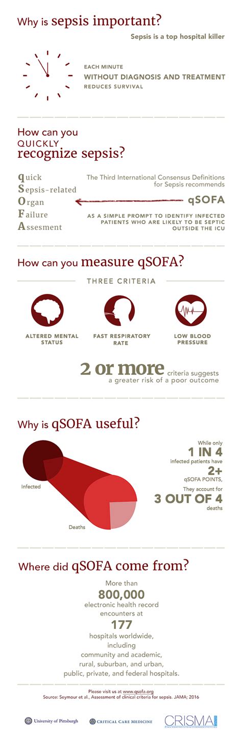 The qSOFA score is a valuable tool in the early assessment of sepsis risk. While it has limitations, it provides a quick and easy way to identify patients who may need further investigation and treatment. Remember, early detection and intervention are key to improving outcomes in sepsis! By understanding the qSOFA score, healthcare professionals can enhance their ability to recognize and manage this life-threatening condition effectively. So, let’s keep learning and striving to provide the best possible care for our patients, guys! In conclusion, the qSOFA score represents a significant advancement in the early assessment of sepsis risk. Its simplicity and ease of use make it a valuable tool for healthcare professionals in a variety of settings, enabling them to quickly identify patients who may require further investigation and treatment. While qSOFA has limitations and should not be used in isolation, it provides a standardized and objective method for assessing the likelihood of sepsis, helping to guide clinical decision-making and improve patient outcomes. By understanding the components of the qSOFA score, how to use it effectively, and its limitations, healthcare professionals can enhance their ability to recognize and manage sepsis effectively, ultimately contributing to better patient care and survival rates. As we continue to learn more about sepsis and refine our diagnostic and treatment strategies, the qSOFA score will undoubtedly remain a valuable tool in the fight against this life-threatening condition.