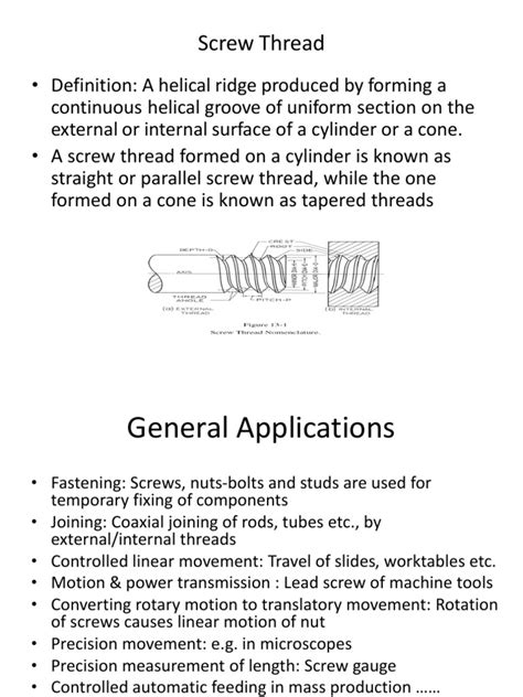 Alright, let’s get down to the nitty-gritty of screw thread operation . When we talk about a screw thread, we’re essentially referring to a helical ridge wrapped around a cylinder or cone. This ridge is designed to engage with a corresponding internal thread (like in a nut or a pre-tapped hole) to create a fastening or a mechanism for converting rotational motion into linear motion. The basic components of an external screw thread – that’s the thread on the screw itself – include the major diameter , which is the largest diameter of the thread; the minor diameter , the smallest diameter; and the pitch diameter , which is an imaginary diameter that intersects the thread groove and ridge at equal widths. You’ve also got the crest , which is the outermost part of the thread, and the root , the innermost part. The flank is the angled surface connecting the crest and the root. The thread angle refers to the angle between the flanks. These seemingly simple geometric features are precisely engineered to ensure a secure fit and efficient operation. The pitch of a thread is the distance between corresponding points on adjacent threads, measured parallel to the axis. A finer pitch generally means more turns are needed to achieve the same linear movement, but it can also provide a more precise adjustment and a stronger hold. Understanding this basic anatomy is the first step to truly grasping how screw threads operate and why their design is so critical in countless applications. It’s this precise geometry that allows for both strong mechanical connections and controlled movement.
