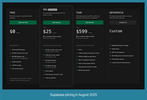 The Enterprise tier is tailored to meet the specific needs of large organizations. Custom resource allocation allows you to configure the resources you need, such as CPU, memory, and storage, to optimize performance and handle peak loads. Dedicated support provides you with a direct line to Supabase engineers, ensuring that you get prompt and effective assistance when you need it. Enterprise-grade security features, such as SOC 2 compliance and advanced access controls, help you protect your data and meet regulatory requirements. The Enterprise tier also offers additional features like single sign-on (SSO), audit logging, and advanced monitoring tools. This tier is designed for organizations that need a highly scalable, secure, and reliable database solution with the highest level of support. It’s a good choice for large enterprises, government agencies, and other organizations with complex and demanding requirements.