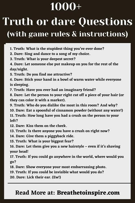 - Have Fun: Remember, the goal of Truth or Dare is to have a good time, so relax, let loose, and enjoy the moment!