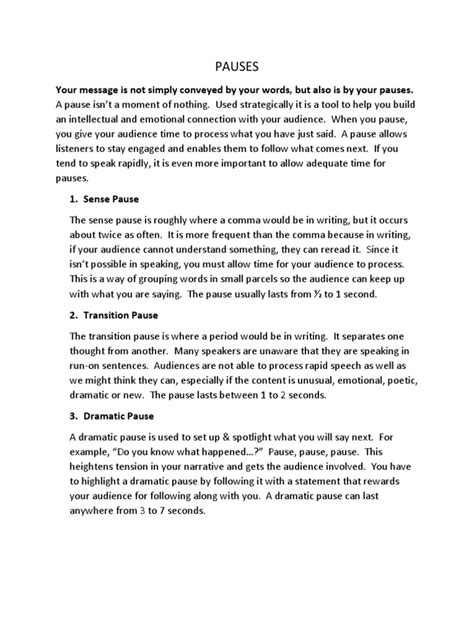 So, why all the fuss about large pauses ? It’s simple, really: they give your audience time to process what you’ve just said. Think about it, guys. When someone is speaking, especially if they’re dropping some serious knowledge or a complex idea, a pause allows listeners to absorb that information. It’s like hitting the ‘save’ button on their brain before you move on to the next point. Without these pauses, information can just fly over people’s heads, leaving them confused and disengaged. A well-timed pause can also build anticipation. Imagine a comedian delivering a punchline. They often pause right before the big reveal, creating tension and heightening the comedic effect. Similarly, in a serious discussion, a pause can signal the importance of the upcoming statement, making your audience lean in and pay closer attention. Furthermore, pauses provide you, the speaker, with a chance to breathe and collect your thoughts. This is crucial for maintaining composure and ensuring your delivery remains smooth and confident. It prevents you from rushing through your points, which often leads to mumbling or making mistakes. Pauses help you control the pacing of your speech, making you sound more thoughtful and deliberate. They can also be used to emphasize key words or phrases. By inserting a brief silence before or after a critical point, you draw attention to it, signaling its significance to your listeners. This technique is incredibly effective in making your message memorable. It’s not just about the words you say, but also about the rhythm and cadence of your speech, and pauses are a vital component of that. So, while they might seem like ‘nothing,’ these breaks in speech are actually packed with communicative power. They are strategic tools that enhance understanding, build engagement, and underscore the importance of your message. Mastering them is a game-changer for anyone looking to communicate more effectively, whether in a professional setting or just in everyday conversations. Let’s get into how you can start using them to your advantage.