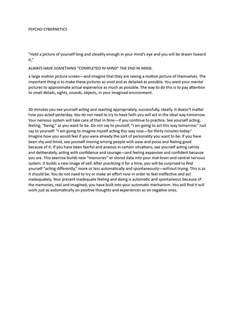 Now, let’s talk about one of the most fascinating and potent tools in the Psycho-Cybernetics arsenal: imagination and visualization . Dr. Maltz emphasized that the human imagination is an incredibly powerful creative force, capable of producing real-world results. He argued that your mind doesn’t necessarily distinguish between a vividly imagined experience and a real one. The emotions, the feelings, the mental rehearsal – they all have a tangible impact on your nervous system and your subsequent actions. Think about it: when you vividly imagine yourself succeeding at something, you start to feel successful. You might experience a sense of confidence, a feeling of preparedness, and a reduction in anxiety. This mental rehearsal primes your brain and body for actual success.