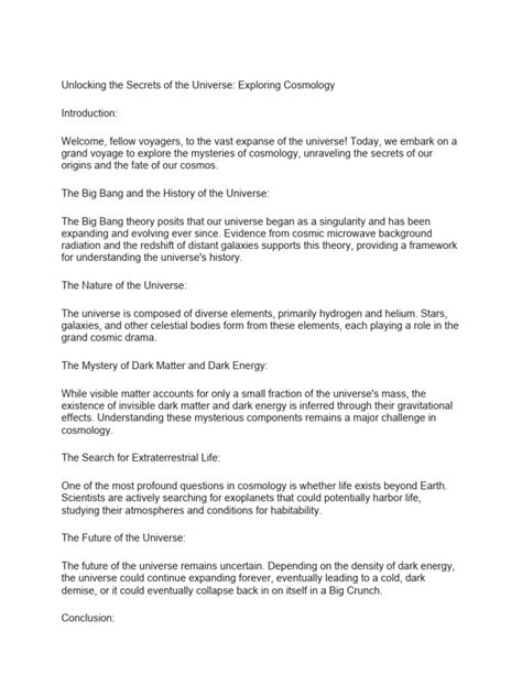 Cosmology is the study of the origin, evolution, and eventual fate of the universe . At the heart of modern cosmology is the Big Bang Theory, which explains the universe ’s origins. This theory suggests that the universe began as an extremely hot and dense state, and has been expanding and cooling ever since. The Big Bang wasn’t an explosion in space, but an expansion of space itself. As the universe expanded, it cooled, and the fundamental particles, like quarks and electrons, began to form. These particles eventually combined to form protons and neutrons, which then formed the nuclei of atoms. Gravity played a key role in clumping matter together, eventually forming stars, galaxies, and the large-scale structures we see today. The evidence for the Big Bang Theory is overwhelming. It includes the observation of cosmic microwave background radiation, the abundance of light elements like hydrogen and helium, and the ongoing expansion of the universe . However, there are still many unanswered questions about the Big Bang. What caused the Big Bang? What happened before it? What is the fate of the universe ? Scientists are actively working to address these questions. Cosmology is a dynamic field, with new discoveries and insights constantly emerging. From the study of the Big Bang to the search for dark matter and dark energy, cosmology continues to revolutionize our understanding of the universe .